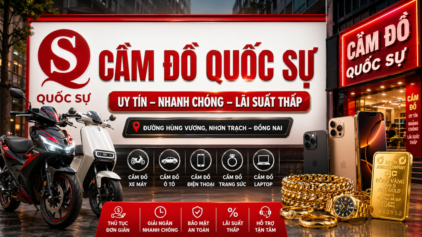 Cầm đồ Quốc Sự là hệ thống cầm đồ uy tín với thương hiệu hơn 20 năm hoạt động, nhận được hơn 95% khách hàng hài lòng và tin tưởng tiếp tục sử dụng dịch vụ cầm đồ. Các tài sản Cầm đồ Quốc Sự chuyên cầm: Xe ô tô, mô tô phân khối lớn, xe máy, đồng hồ, kim cương, vàng, máy ảnh, laptop, điện thoại, Ipad,… Xuyên suốt nhiều năm hoạt động trong lĩnh vực cầm đồ, chúng tôi đã phục vụ cho rất nhiều khách hàng cá nhân và doanh nghiệp có nhu cầu về tài chính với phương châm TẬN TÂM – UY TÍN LÀ HÀNG ĐẦU – NHANH CHÓNG – AN TOÀN – LÃI SUẤT THẤP. Hệ thống Cầm Đồ Uy Tín của chúng tôi đã sẵn sàng đồng hành vượt qua khó khăn cùng bạn! Thủ tục cầm đồ tại mỗi chi nhánh rất đơn giản, ký hợp đồng chỉ trong 15 phút. Dịch vụ Cầm Đồ Quốc Sự định giá lên đến 90% giá trị tài sản đối với tất cả các loại tài sản. Lãi suất cầm cố thấp và thông báo đến khách hàng rõ ràng. Hãy ghé các chi nhánh hệ thống Cầm Đồ Quốc Sự tại Nhơn Trạch ngay hôm nay để được tư vấn cụ thể mỗi loại tài sản cầm cố.